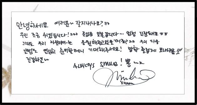 Sebenernya message ini udah cukup lama dipublish, waktu musim panas kemarin sebelum mereka berangkat debut ke Jepang. Tapi berhubung english translationnya baru keluar di KH, nggak ada salahnya juga kalo dishare sekarang. Here we go: